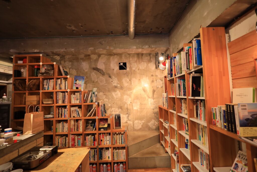 そしてここ、多分、Tさんはめちゃくちゃ気に入るはず。品川神社と同様、売られている古本のほとんどが旅に関するもので、窓から階段にかけての一面の壁には北海道から沖縄まで、各地の本がぎっしり。