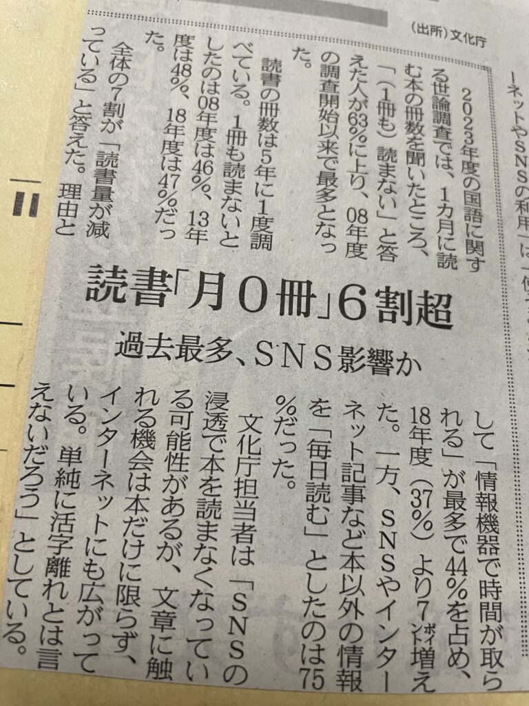 今朝の日経の社会面で「読書『月0冊』6割超」という記事があった。